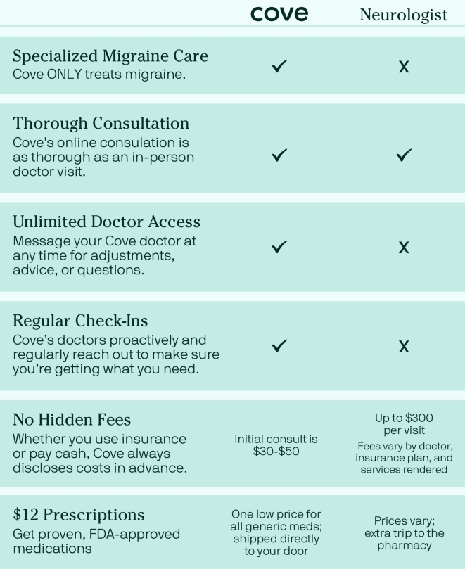 All generic prescriptions are just $12 a month. Cove offers 20+ FDA-approved prescription medications. Your doctor will work with you to determine which medication(s) is best for your migraine.